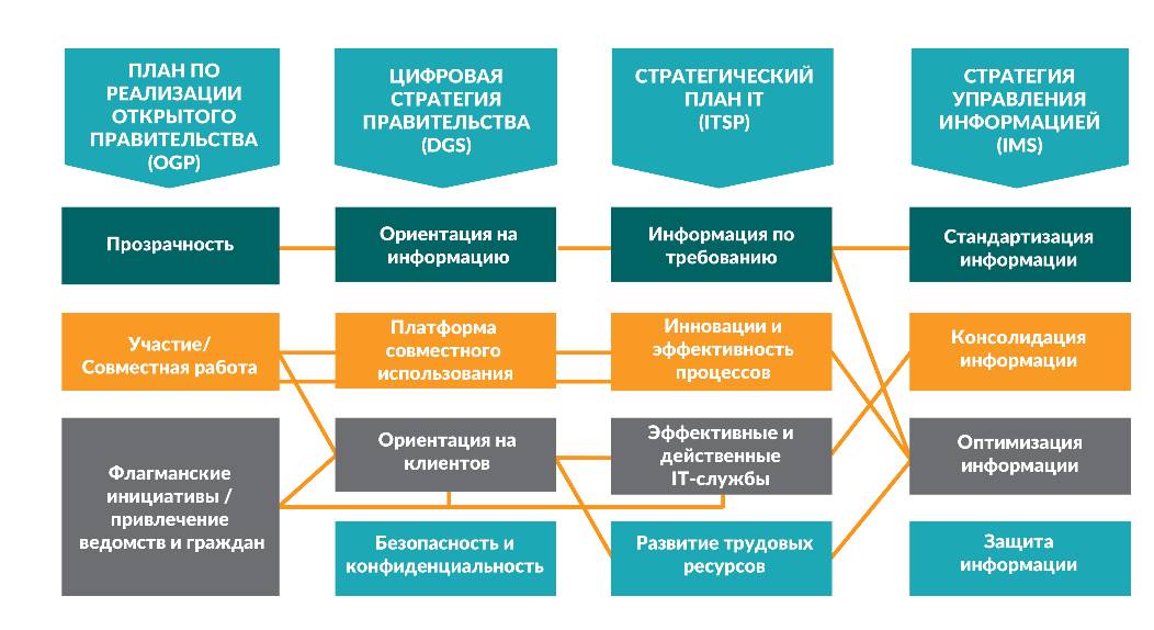 Рис. 1.7. Соответствие между Планом реализации открытого правительства США, Стратегией цифрового правительства, Стратегическим планом ИТ и Стратегией управления информацией65