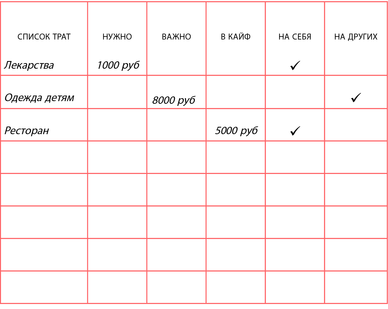 В последних двух колонках ты отмечаешь траты по принципу «На себя» или «На других». Покупка одежды ребенку – это нужда семьи. Купить вещи мужу – тоже. В колонке «На себя» ты отмечаешь только те траты, что касаются твоего тела, образования, здоровья, красоты, т. е. все, что можно потратить только на себя любимую. Заполненная табличка должна выглядеть примерно вот так: