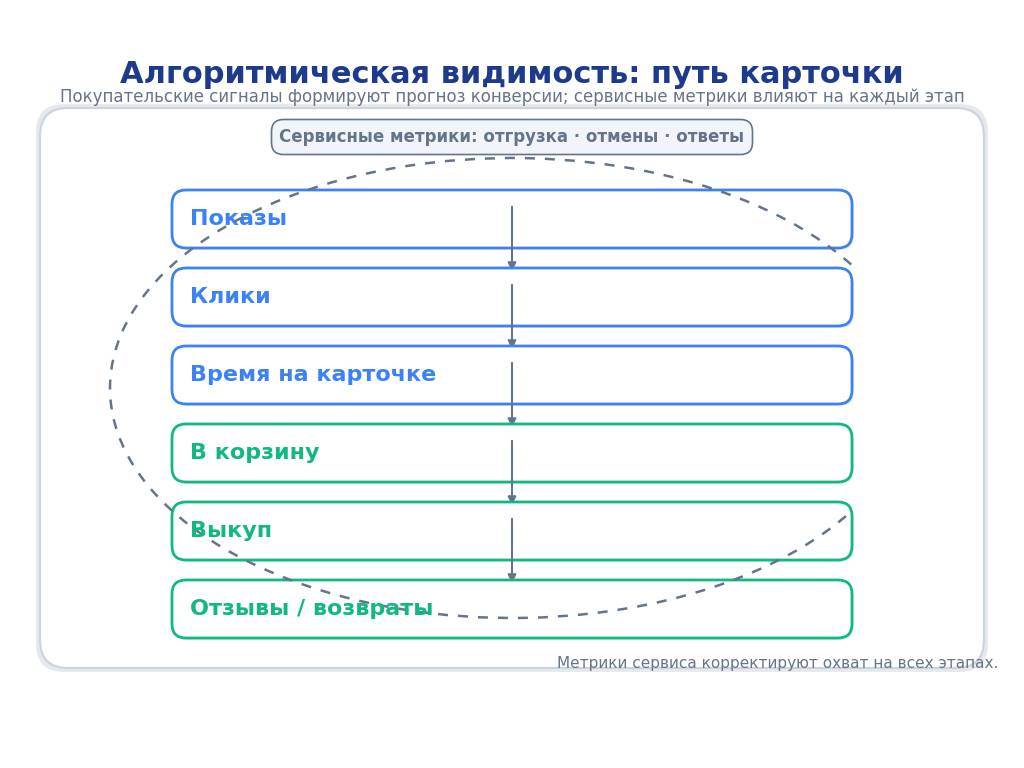 Охват карточки формируется цепочкой сигналов: показы – клики – время на карточке – добавления в корзину – выкуп – отзывы/возвраты. Дополнительно учитываются сервисные метрики: сроки отгрузки, доля отмен, корректность ответов на обращения. Система смотрит на связку целиком: локальная просадка (например, частые отмены или медленная доставка) снижает прогноз конверсии и сужает охваты.