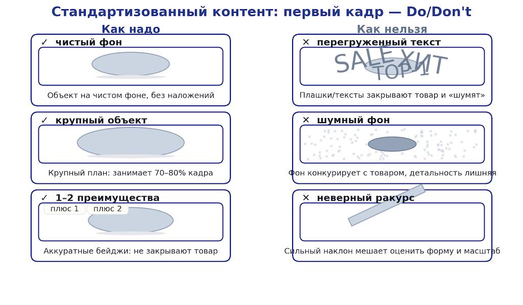 Требования к первому кадру, атрибутам, вариациям, комплектам и маркировке фиксированы и зависят от категории. Незаполнённые или неверные атрибуты ухудшают сопоставимость товаров и выдачу в фильтрах; «грязный» первый кадр снижает кликабельность. Разнесённые вариации лишают карточку общей истории отзывов и накопленного «веса».