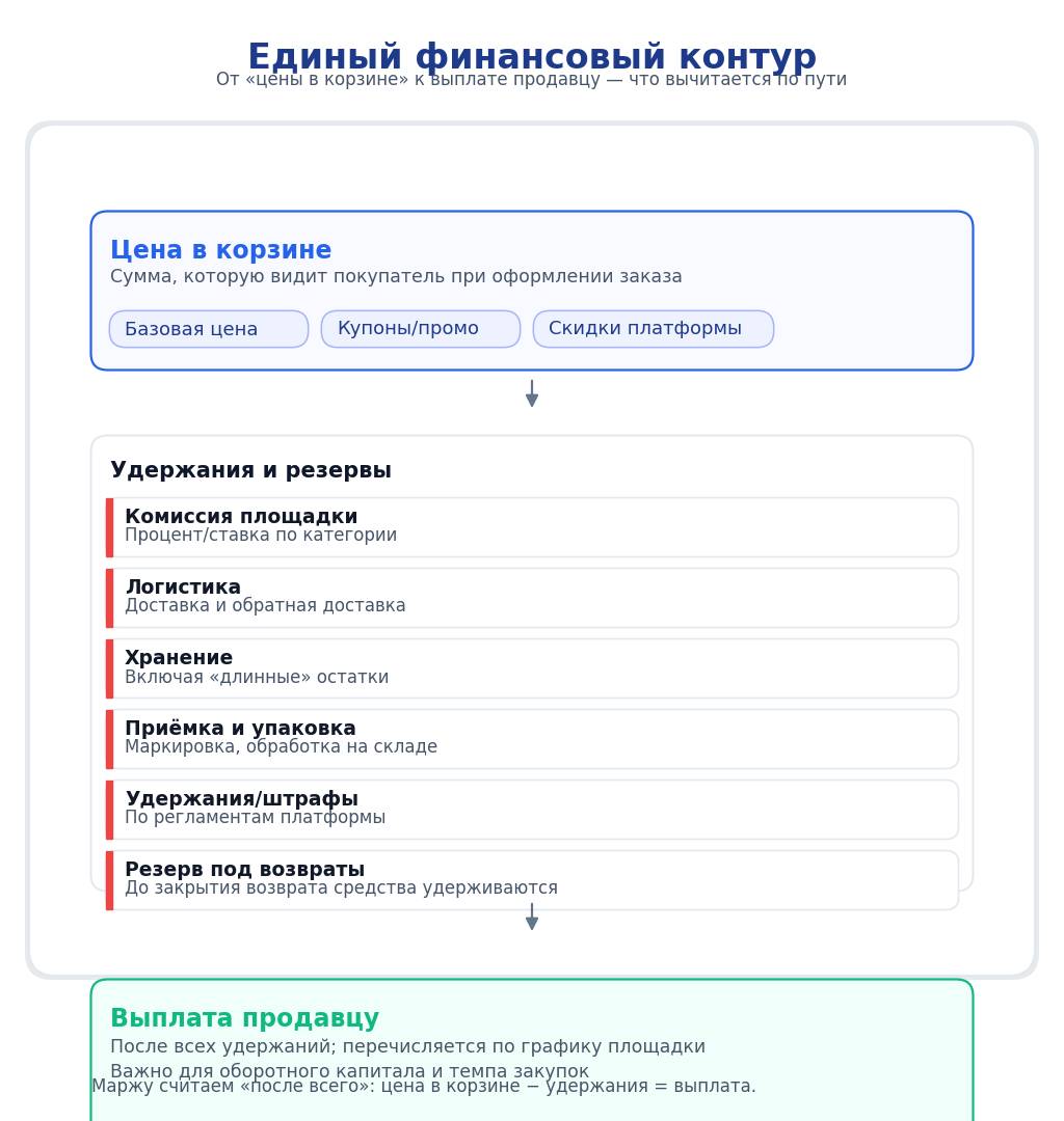 Выплаты идут по графику площадки с учётом комиссии, тарифов на логистику, хранения, упаковки, обратной доставки и возможных удержаний. Итоговая цена в корзине складывается из базовой цены, промо и скидок, поэтому маржинальность считается «после всего», включая расходы на возвраты и длительное хранение.