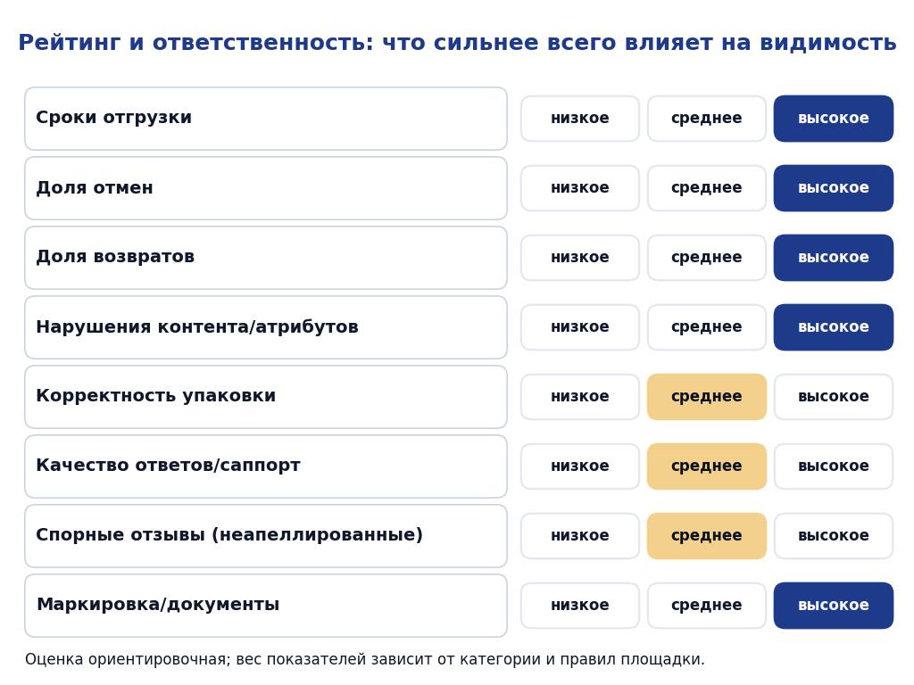 Отдельные рейтинги товара и продавца, а также сервисные показатели (сроки отгрузки, доля отмен, корректность упаковки, скорость ответов) влияют на место в выдаче. Рост возвратов и системные нарушения регламентов увеличивают издержки и могут ограничивать показ карточек.