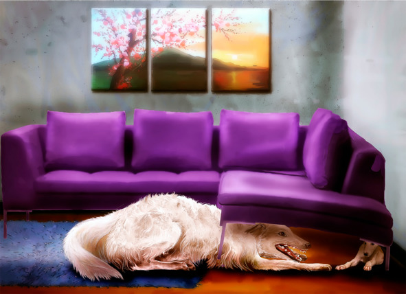 Щенок, увлечённый весёлой игрой, влетев в гостиную, не справился с поворотом и, скользя по скользкому полу, с налёту врезался головой прямо в свешенные лапы лежащего в соседнем кресле Свирепа.