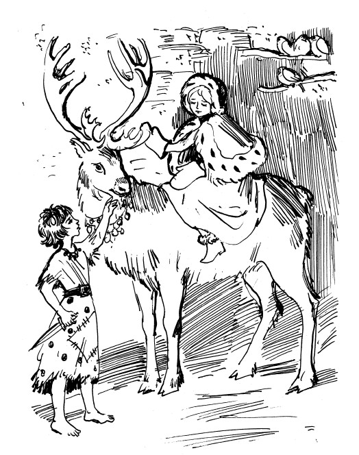 Северный олень подпрыгнул от радости. Маленькая разбойница посадила на него Герду, крепко привязала её, ради осторожности, и подсунула под неё мягкую подушечку, чтобы ей удобнее было сидеть.