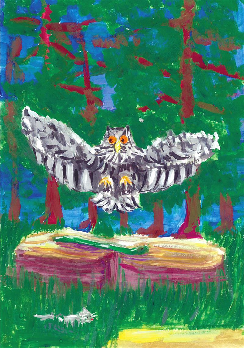 Есть в лесах одна птица пернатая,От природы она диковатая,В старых дуплах деревьев прячется,Среди птиц самой умной значится.На весь лес она громко хихикает,В темноте будто лешего кликает,Головой крутит в разные стороны,Слышит самые тихие шорохи.Она тёмных ночей попутчица,По полям летает лазутчица.Не упустит добычу хищница,С высоты на неё накинется.Внешне птица очень красивая,По характеру неспесивая.А глаза у той птицы круглые,Для неё они слишком крупные.В голове прячет мысли мудрые,Строит планы свои хитроумные.Лапы птицы укрыты латами,Её детки зовутся совятами.Птица сильная, птица странная,Всему миру она желанная.Показав свои серые перья,Взмахом крыльев гладит деревья.Ни о чём она не печалится,Со своими врагами сражается.Кружит, мира ночного избранница,В темноте одинокая странница.