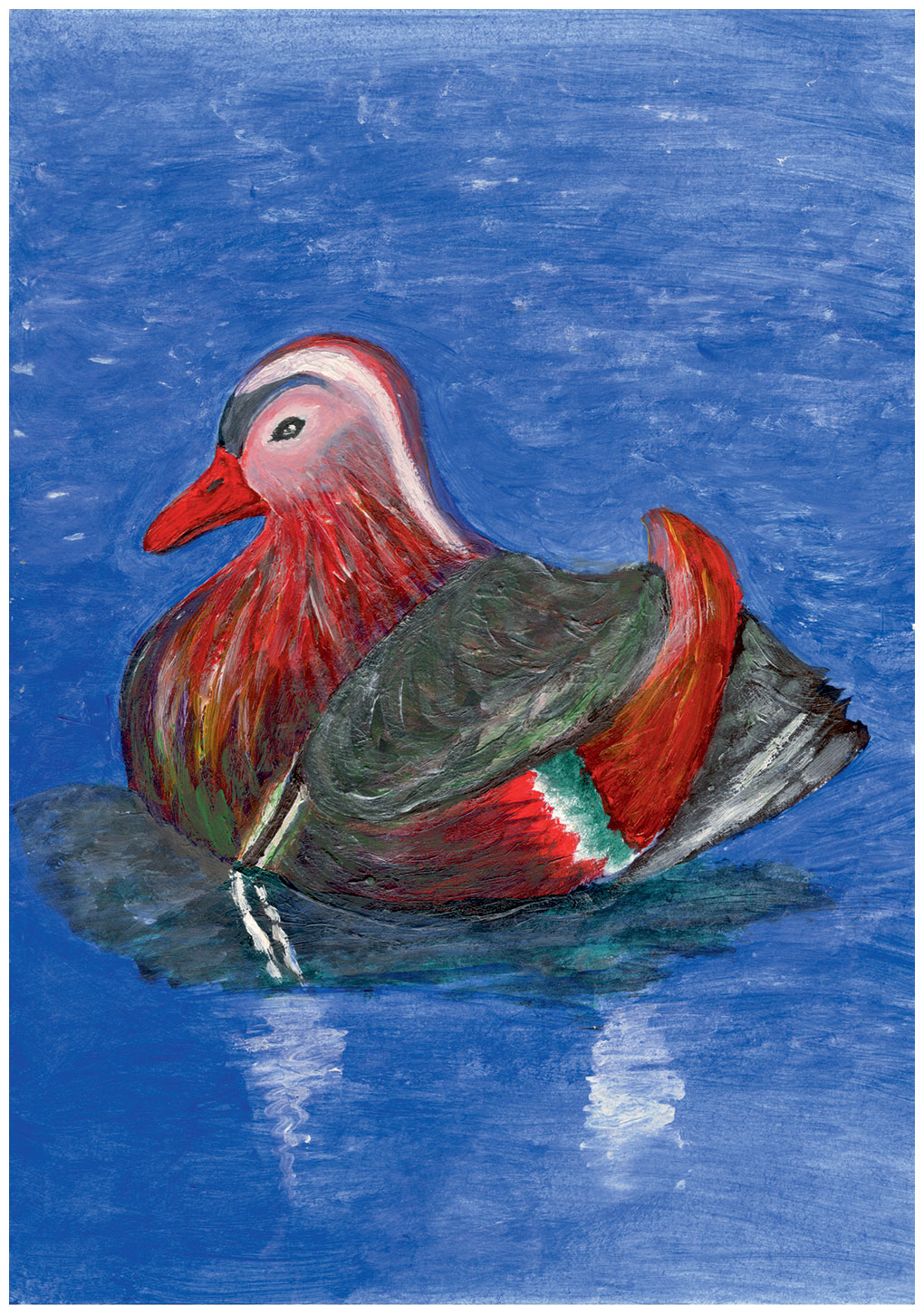 Рассматривая картинки,Угадывал Федя птиц.Дивные перья на спинкеТам были у единиц.Он знал воробья и синицу,Но на одной из страницУвидел Федя певицу,C перьями рыжих крупиц.Смотрит мальчик пытливо:– А где же она живёт?И настоящее диво,Что птица красиво поёт!Она оказалась уткой,Живущей у дальних границ,С яркой сиреневой грудкой,С полоской у белых ресниц.На лапках жёлтые гольфы,И синий край у крыла.Хвост у неё в виде гофры,Серьга на шею легла.