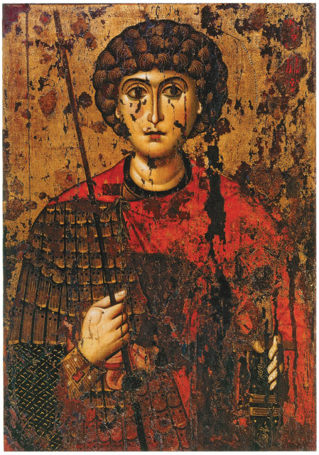 Св. Георгий, воин римского императора Диоклетиана, был подвергнут жестоким истязаниям и обезглавлен за то, что открыто исповедовал христианскую веру. Смелый и решительный, он прославился многими чудесами, которые часто изображают на иконах. На Руси Георгия почитали как покровителя и защитника стад от хищных зверей.