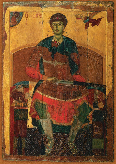 В редком «тронном» изображении Дмитрий Солунский предстает как небесный покровитель земного владыки – великого князя Всеволода; об этом свидетельствуют княжеский венец на его голове и полуобнаженный меч (святой словно готовится вручить его Всеволоду как символ его княжеского достоинства). Перед нами торжественный и величавый образ идеального правителя и воина-защитника.