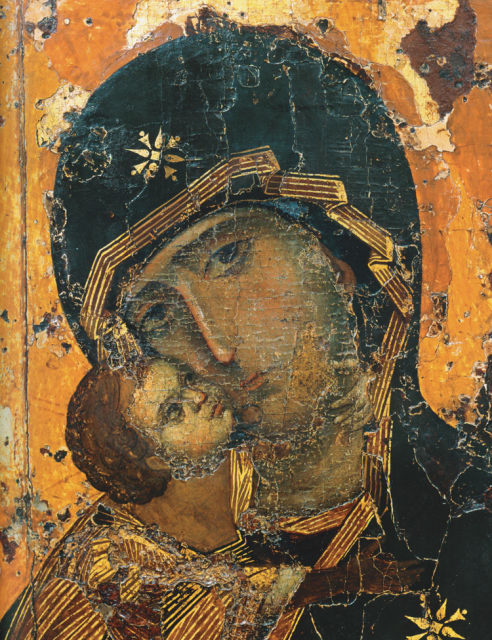 Икона Владимирской Богоматери была привезена в Киев из Византии. В 1155 году князь Андрей Боголюбский перевез икону в Успенский собор Владимира, где она прославилась многочисленными чудесами, уцелела во время монголо-татарского разорения. Во время нашествия Тамерлана 26 августа 1395 года икону торжественно перенесли в Москву, и в этот же день Тамерлан из-за охватившего его страха и трепета отказался от сражения и ушел за пределы России. Владимирская Богоматерь – один из самых совершенных образцов иконографического типа «Умиление». Мария бережно поддерживает Младенца Иисуса правой рукой, а он льнет к матери, обнимая ее за шею и прижимаясь к ее щеке. Их объятия – прообраз полноты Божественной любви, высшим воплощением которой является жертва, принесенная Христом для спасения людей. Огромные проникновенные глаза Богоматери полны «нездешней» любви и вечной, «надмирной» скорби, они устремлены к людям, ждущим помощи, защиты, спасения.