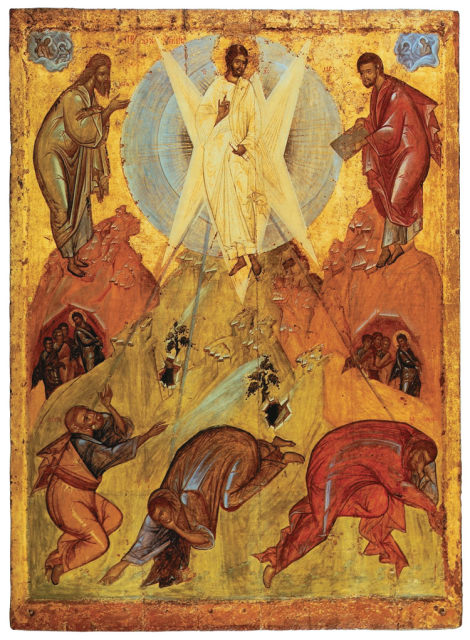 Согласно Евангелию, Христос с тремя учениками (Петром, Иаковом и Иоанном) взошел на гору Фавор и «преобразился» перед ними – явил свою Божественную природу: «и просияло лицо Его, как солнце, одежды же Его сделались белыми, как свет» (Мф., 17:1–9). Ему явились пророки Илия и Моисей, а с небес раздался глас: «Сей есть Сын Мой Возлюбленный, в Котором Мое благоволение; Его слушайте» (Мф., 17:1–9). Ученики, увидев это, сильно испугались и пали ниц. Иисус же коснулся их, велел встать и не бояться.