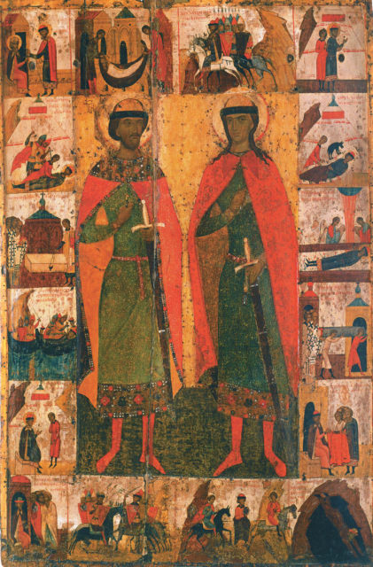 Борис и Глеб, младшие сыновья киевского князя Владимира, вскоре после смерти отца были вероломно убиты по приказу их старшего сводного брата Святополка, который хотел завоевать киевский престол. Они стали первыми русскими святыми, канонизированными Русской православной церковью в 1071 году. Образы братьев в среднике иконы отличают просветленность и ясность, их лики наполнены «совершенной» любовью, которая «изгоняет страх». В клеймах представлены сцены из жития Бориса и Глеба, где на основе нескольких летописных и литературных источников рассказывается об их «погублении» и о бесславной кончине коварного Святополка, который был побежден Ярославом Мудрым и провалился в разверзшуюся землю «меж чехи и ляхи».