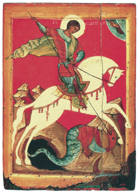 По византийской версии легенды, св. Георгий, направляясь в Каппадокию, увидел плачущую царевну. Она рассказала ему, что рядом с ее родным городом появился страшный змей, который требует себе в жертву детей горожан. И теперь очередь дошла до нее – царской дочери. Св. Георгий, осенив себя крестным знамением и призвав Господа, устремился на змея, и «ударив змея с силою в гортань, поразил его и прижал к земле; конь же святого попирал змея ногами». После чего Георгий велел царевне связать змея поясом и вести в город. Жители города, пораженные свершившимся чудом, приняли христианскую веру. На замечательной иконе новгородской школы св. Георгий предстает во всем «небесном» великолепии: его плащ эффектно развевается за спиной, белый конь встает на дыбы и топчет змея, копье, как молния, рассекает воздух, пронзая пасть чудовища. Наверху справа в голубом сегменте Господь благословляет святого на битву. Впечатление яркого торжества добра над злом довершается ярко-красным фоном иконы.