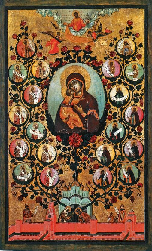 На этой иконе впервые в отечественном искусстве представлены раздумья о русской истории и о величайшей русской святыне – «Богоматери Владимирской». Древо государства Московского, ветви которого прорастают сквозь Успенский собор, сажают князь Иван Калита и первый московский митрополит Петр. Образ Владимирской Божьей Матери – главной покровительницы и заступницы Русского государства – осеняет и объединяет собой все древо. На его ветвях цветут пышные цветы, свисают виноградные грозди как напоминание о райском саде, который ожидает праведников. Среди этих «райских кущ» плоды древа государства Московского – медальоны с обликами владык духовных и светских, своими неустанными трудами и подвигами способствовавшими росту и процветанию этого древа.