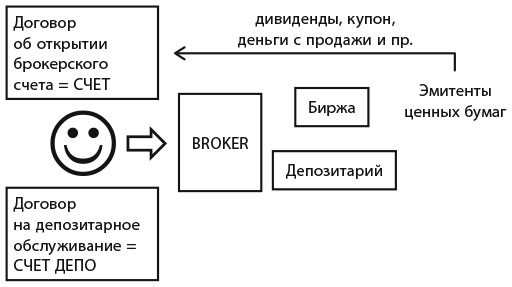 Чтобы купить акцию или облигацию какой-то крупной компании, вам нужно заключить договор с брокером, установить программу на компьютер, завести деньги на брокерский счет и осуществить покупку. Пошаговые инструкции к этому будут в следующих главах. Запомните главное – без брокера инвестирование невозможно.