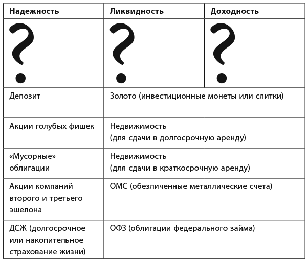 Как не бывает индивидуального пошива одежды дешево, качественно и быстро, так не бывает и надежных, ликвидных и одновременно доходных инструментов. Инвестиционный портфель должен быть распределен между ними тремя.