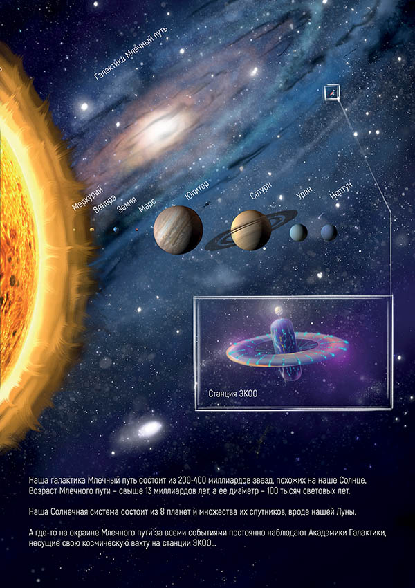Космическая станция ЭКОО находилась на окраине Млечного Пути. Ученые собирались здесь один раз в год, чтобы проанализировать ход развития построенных планет и, как сегодня, закрыть те из них, где эксперимент зашел в тупик. Эти ученые были представителями цивилизации Ксармония, которая уже давно вышла за пределы своей галактики ФЭР-1727. Эта цивилизация добилась огромных успехов – ее представители научились жить по несколько тысяч лет, но вот вечная жизнь, о которой так мечтали ксармонийцы, так и оставалась для них непостижимым секретом. На протяжении миллиардов лет цивилизация Ксармония активно осваивала и изучала близлежащие галактики, в числе которых находилась и галактика Млечный Путь, где были построены Солнце и планета, названная Землей.