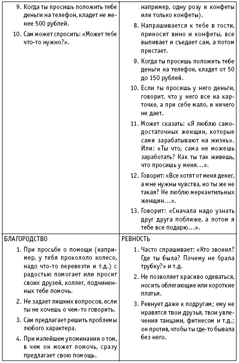 Алексей ВиноградовНа самом деле понять, что представляет собой твой избранник и каковы его намерения, совсем несложно. Нужно только проанализировать его поступки и слова. Поможет тебе в этом наша таблица классификации типов мужчин. Ты можешь быть уверена в ее достоверности – ведь она составлена квалифицированными психологами на основе многолетнего опыта работы с участницами тренингов и мастер-классов. Большинство девушек и женщин, воспользовавшихся «показателями качеств личности», уже встречаются, а некоторые даже имеют серьезные отношения с достойными, щедрыми и благородными мужчинами, которых они выбрали сами!