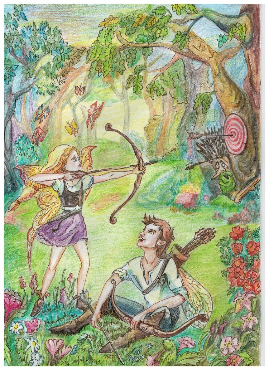 Мальчик взял лук, вставил в него стрелу, прицелился, чуть прислушался и отпустил тетиву. Стрела зазвенела и полетела к дереву, стоящему на другой стороне поляны. Девочка побежала вслед за ней. Там, на высоком старом дубе, висела деревянная доска, с нарисованной на ней мишенью, и прямо по центру неё торчала стрела.