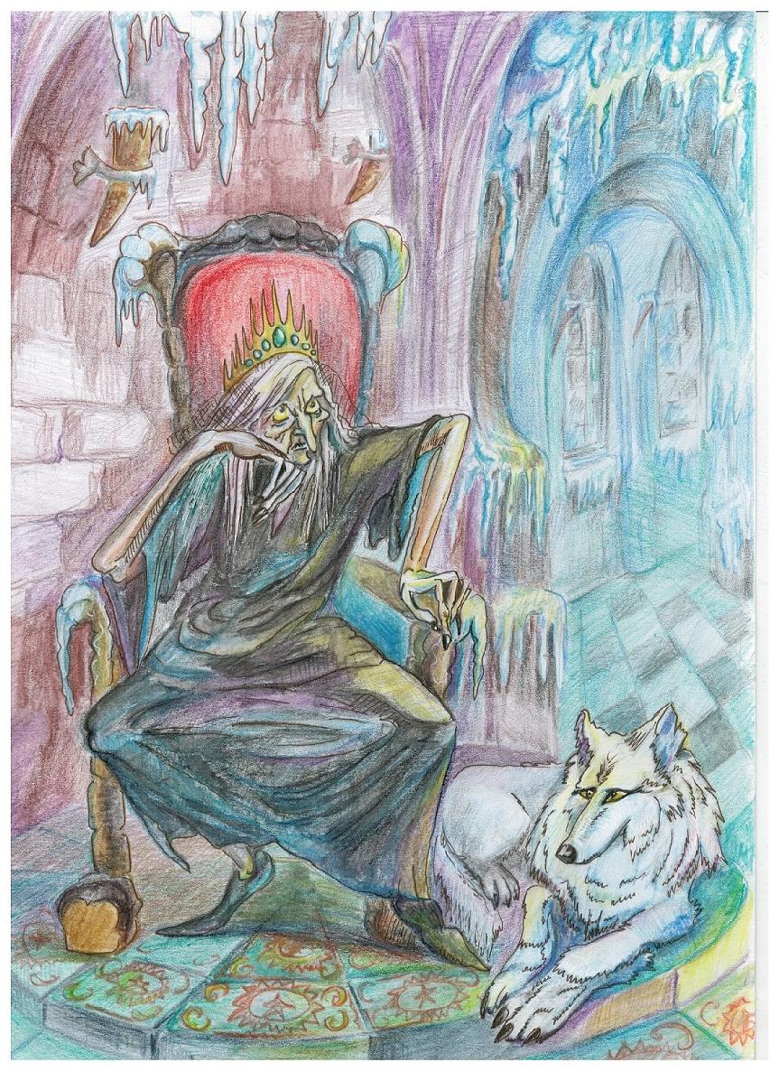 Снег лежит кругом. Куда ни глянь: белым-бело и лишь холодный снег, да ледяные глыбы. На много тысяч вёрст протянулся этот ледяной простор. Нет здесь ни людей, никакой другой живности. Да и кто захочет здесь жить?! От такого мороза душа стынет, мурашки по коже бегают, от одной только мысли об этой холодной красоте. Только высокие чёрные горы возвышаются над этим мёртвым пространством и вершинами упираются в тяжёлые свинцовые тучи. Но именно здесь живёт Арида Лучезарная, самая злая и могущественная колдунья на свете. Пряди седых волос, покрытые чёрной вуалью, ниспадают ей на глаза. Когда-то она была очень хороша собой. У неё была бархатная смуглая кожа и румяные щёки с озорными ямочками, а её большие глаза были настолько выразительными и красивыми, глубокого синего цвета, в обрамлении длинных ресниц, цвета вороньего крыла, что посмотревший в них однажды навеки становился их добровольным пленником. Слава о её красоте гремела на весь свет, и не было отбоя от претендентов на её руку и сердце. Такой она была, но не теперь. Глаза поблёкли, стали мутными, грязно-синими, ресницы поредели и побелели. Кожа на лице потемнела и сморщилась, провалились щёки. Из-за отсутствия зубов, уголки, когда-то прекрасных алых, губ, повисли вниз. Нос иссох и стал похож на одну их тех сосулек, что окружают всё вокруг. И сердце давным-давно превратилось в кусок льда, ничто её не радовало и не удивляло. Это была старая, лохматая, злая, потому и несчастная женщина. Её замок возвышался на одной из чёрных гор, будто он сам вырос из камней, поражая своей ужасной, мрачной красотой. День за днём она сидит одна в огромном зале, с беспросветными ставнями, в своём угрюмом одеянии, в чёрном, массивном дубовом кресле, перебирая в голове такие же чёрные мысли. А мысли её, вот уж сколько лет, об одном и том же. Как за такое короткое время она, самая красивая в мире колдунья, превратилась в старую развалину. Лучезарная, так её называли, ещё совсем недавно светилась, словно солнце. Куда всё это делось? Она, конечно, знала ответ на этот вопрос. Её состарила злоба, ненависть и страх. Ах, если бы она не пошла тогда к Оракулу, если бы ничего не узнала, как бы тогда сложилась её жизнь?