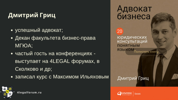Дмитрий Гриц – в настоящее время успешный адвокат, руководитель компании Гриц и партнеры, декан факультета бизнес права МГЮА им. О.Е.Кутафина, частый гость на конференциях, выступает с семинарами для юридического сообщества и предпринимателей, автор книги «Адвокат бизнеса».