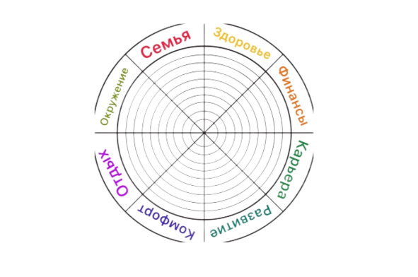 Возьмите лист бумаги (или любой редактор в компьютере) и нарисуйте большой круг. Разделите его на восемь (или другое число – определить под себя) равных частей, как пиццу. Каждый раздел представляет собой область вашей жизни, которую вам необходимо сбалансировать, например, работу, семью, хобби, здоровье и так далее.