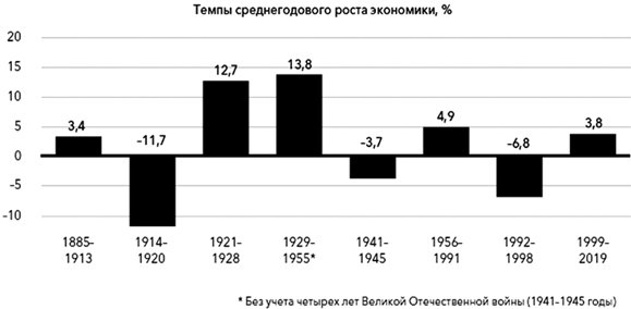 «Таким образом, высокий рост экономики в 1929–1955 годах происходит не от низкой базы, не за счёт наращивания долга или благоприятной мировой конъюнктуры; происходит несмотря на самую кровавую и разрушительную в мировой истории войну в середине этого периода (1941–1945), унёсшую жизни 27 миллионов человек; сопровождается большим ростом продолжительности жизни, численности населения и его доходов».