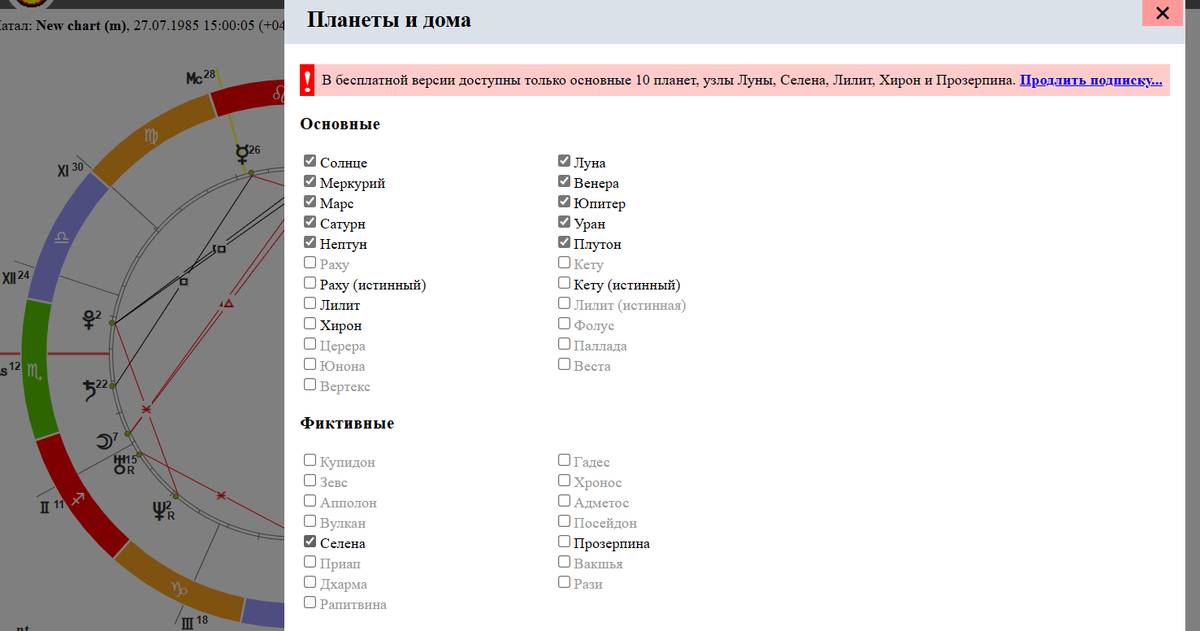 Ставим галочку рядом с названием планет, которые хотите, чтобы отражались в гороскопе. Нажимаем Ок.