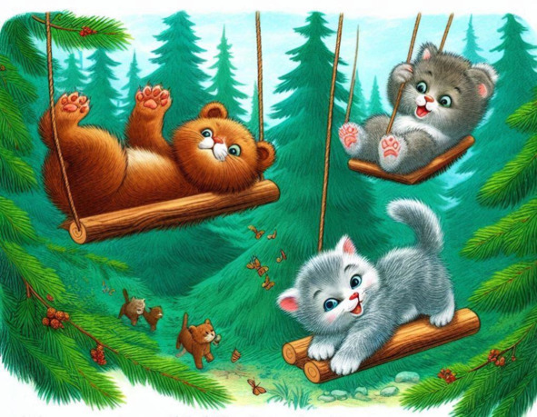 Шум и гам в лесу стоитМиша вверх и вниз летит.Три веселые котенкаЗдесь катают медвежонка.Сами сделали качели,Ветки – сильные у ели.Плющ зеленый привязали,Вместе все кататься стали.Вот веселье, вот, потеха —Лес дрожит уже от смеха.Белка шишку уронила,Как ворона, рот раскрыла.Рык медвежий раздаётся-Это Миша так смеется.Замерла вдали лягушка,Спряталась в дупло кукушка.Хитро рыжая лисицаСмотрит, кто так веселится.Мишка птицей притворилсяИ, как мячик, приземлился,Так удачно – в куст малиныДень веселья – сладкий, длинный!