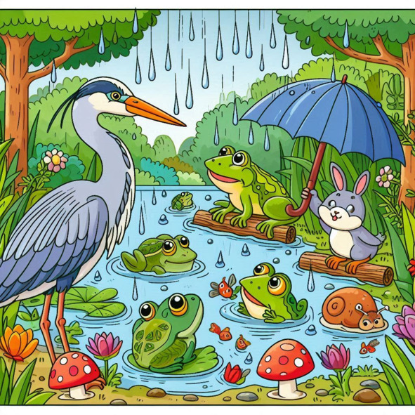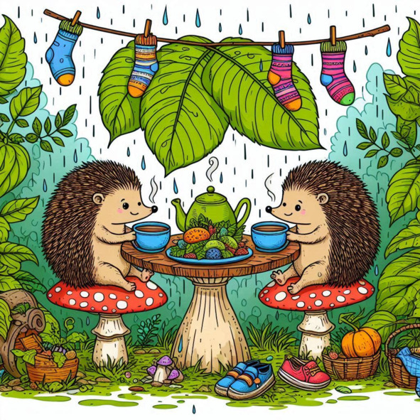 Пляшет ёжик на опушке,А медведь поёт частушки.Лоси тоже в пляс пустились,Но рогами зацепились.Волк пришел, зубами щелкнул-Лоси спрятались за елки.И лиса пришла с енотом,Белка в шубе с отворотом.Зайцы прибыли гурьбой,И пищат на перебой,Прыгают лесные птицы,А цветы, раскрыв ресницы,Смотрят ласково на всех:– Что за праздник? Что за смех?Дождь пришел к нам долгожданный,Чистый летний друг желанный!Все напились, посвежели,А улитки в колыбелиВместе с жабками мечтают,Ветки нежно их качают,Пьют росинки и растут.Сплел паук для всех батут,А на нем сверкают капли.Оживились даже цапли:Прибыла вода в болоте,А они здесь на охоте.Но стоят, как балерины, —Грациозны и невинны.И за рыбками следят,Если словят, вмиг съедят.Дождь принес им в утешеньеНебольшое наводненье.