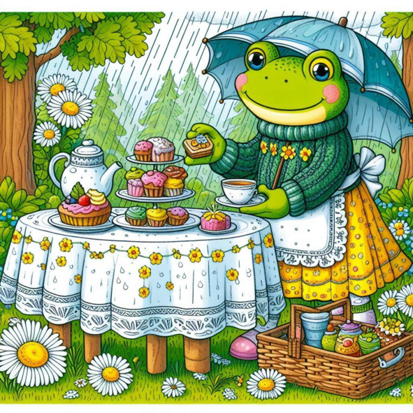 Дождик прыгал и скакалЛил без устали, плясал.А зелёные лягушки —Лучшие дождя подружки.Все на дачах отдыхают,Наслажденье получают.Ведь, для дружного народаНе страшна и непогода.Лежа в листиках читают,Деток маленьких качают.Всем готовят угощенье —Земляничное варенье.Бабушка печет ватрушки,Вдруг, пожалуют подружки.Чай зеленый ароматныйПахнет, пар – такой приятный.На зелененьких ветвях —Стол в цветочных кружевах.В белом кружеве ромашки-Чайничек и даже чашки.И улитки всей семьейВ гости к ним пришли домойС пирогом и земляникойПод зонтом из повилики.Здесь фонарик – светлячок,Песенки поет сверчок.В день дождливый создаютВ доме радость и уют.И за шторами дождинок,Сочных листиков, былинок —Жизнь своя, любовь и вераИ, конечно, атмосфера.