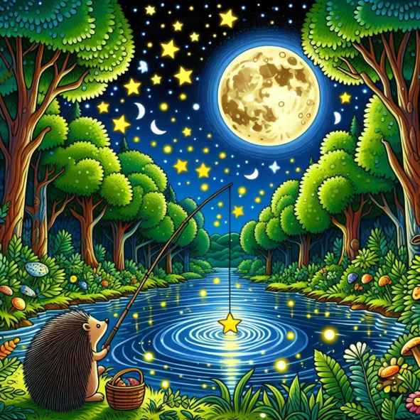 День ушел, а с ним жараСпят все звери до утра.Только ежику не спится,Ухает ночная птица.Светят в глазки светляки,Весело им у реки.Ночь летит над лесом соннымМягким, пышным и зеленым.В небе звездные дорожки,А в реке сияют крошки —Звездочка с небес упалаИ в воде тотчас пропала.Ежик наш не мог не встать-Надо ж звездочку спасать.Сделал лодку из листа,Весла – ветки от куста.Светлячок – волшебной шарикВмиг зажегся как фонарик.Ежик взял еще и снастиИ со дна – какие страсти! —Выловил звезду для ночи,Только пусть не плачет очень.А шалунья-ночь смеяласьИ со звездами купалась.Видел ёжик, что рекаОтразила облака,Звезды, месяц, млечный путь…Так красиво – не уснуть!