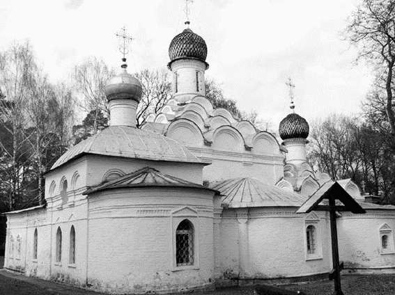 Среднюю часть храма венчала живописная пирамида из кокошников с венцом в виде луковичной главки. Световой барабан центрального купола смотрел на прихожан узкими прорезями окон и опирался на распалубку, благодаря чему небольшое здание казалось выше снаружи и просторнее внутри. Своеобразным украшением служили окна в круглых апсидах – узкие, окаймленные скромными наличниками и забранные решетками, они позволяли солнечным лучам свободно проходить в зал, где не было ни росписей, ни богатого иконостаса, которых, впрочем, нет и сейчас. Все убранство церкви до сих пор составляют чисто выбеленные стены, черно-белый плиточный пол и отнюдь не драгоценная утварь – подношения часто сменявших друга друга вотчинников.