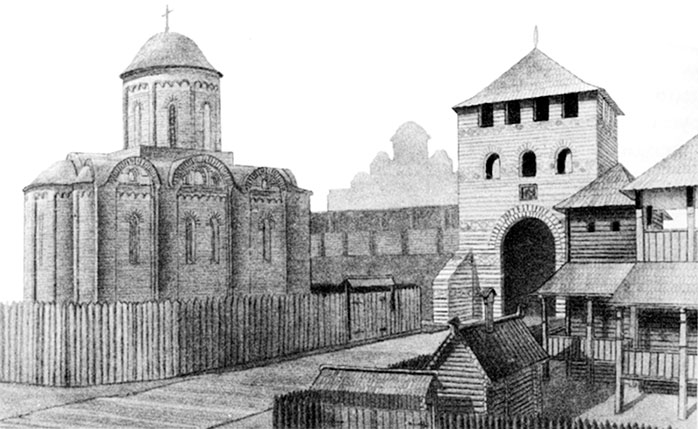 Древнерусскую крепость именовали городом, кремлем или детинцем. Происхождение самого слова осталось загадкой истории, хотя его значение известно: «внутреннее, противопоставленное внешнему поясу обороны укрепление», то есть «крепость в крепости». Детинец, где обитал князь со своей дружиной, начал существовать после того, как Киев окружила вторая стена. Скрытый высоким забором, он являлся наиболее защищенным районом города и был недоступен для некоторой части общества, например для приезжих купцов.
