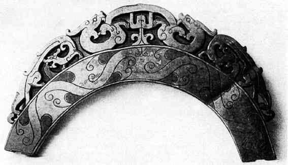 Бытовые предметы, так же как и сооружения той поры, позволяют судить о мастерстве ремесленников, бережно хранивших обычаи государства Инь. Изменения в декоративном искусстве можно проследить, сравнивая рисунки на вазах и шелке, узоры на архитектурных деталях, но особенно сюжеты рельефов, сплошь покрывавшие нагрудные знаки царей Чжаньго. На смену условности и строгому чеканно-ясному изображению пришел реализм, затронувший как содержание, так и способы его воспроизведения. Художники Чжоу стремились к мягким изысканным линиям. По блестящей поверхности посуды струились орнаментальные пояса, составлявшие единую композицию со скульптурно оформленными ручками.