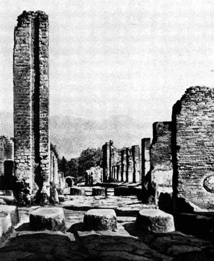 Однако не эллины, а именно римляне первыми строили типовые города, основываясь на прямоугольной схеме планировки своих военных лагерей. В начале V века общая площадь Помпей составляла более 65 га. Не слишком обширное пространство пересекали короткие, узкие переулки и широкие улицы. Отменной прочности мостовые были выложены лавовыми плитами и обрамлены бордюрными камнями. Верхний их слой составляли плотно притесанные друг к другу камни неодинаковой величины и формы, уложенные на цементный фундамент. При заделке мелких деталей строители применяли железные костыли или засыпку щебнем. От 3 до 9 м вымощенного пространства считалось достаточным для разъезда двух колесниц.