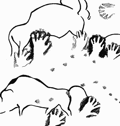 Силуэты рук и очертания бизона в наскальной живописи. С рисунка в гроте Дель Кастильо