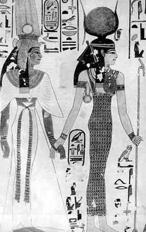 Тенденция противопоставления свойственна всем произведениями древнеегипетского искусства, но особенно ярко проявляется в настенных росписях. На рисунках в гробнице Нефертити царица изображена в подчеркнутом контрасте с богиней Изидой. Согласно традиции, супруга фараона Эхнатона ушла в загробный мир юной красавицей в белом каласирисе из полупрозрачного шелка, с золотым воротником и в высоком головном уборе с грифом, издавна служившим символом царской власти. Имя египетской царицы Нефертити сегодня знакомо всему миру. Супруга Аменхотепа IV (Эхнатона) вдохновила фараона на коренное преобразование политической и культурной жизни Древнего Египта. Однако славой она обязана не особой исторической роли, а своей необыкновенной красоте, увековеченной в работах скульптора Тутмеса. Влюбленный ваятель создал идеал женственности, заставляющий забыть о времени и пространстве. Спустя тысячелетия образ прекрасной царицы стал символом Древнего Египта наряду с пирамидами Эль-Гизы.