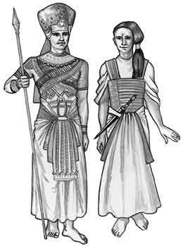 Жизнь египетских владык полностью подчинялась религиозным ритуалам. Мирские и духовные категории сливались для них воедино. Определенный высоким положением регламент не мог изменить никто, включая самого фараона. С его смертью нарушалась мировая гармония, народ пребывал в смятении, а страна нуждалась в преемнике божественной власти. Нового царя встречали как бога, венчая его голову двойной, красно-белой, короной, олицетворявшей власть над Верхним и Нижним Египтом. Костюм правителя состоял из златотканого фартука, покрытого спереди куском жесткого полотна треугольной формы с царской символикой. Такие же треугольники, но без орнамента носили придворные и высшие чиновники.