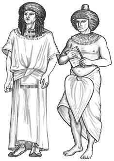 До царствования Тутмоса III (1490–1436 годы до н. э.) простую рубаху носили знатные особы, но затем этот наряд видоизменился, в чистом виде оставшись рабочей одеждой, подобно примитивным формам фартука. Фараоны носили сандалии из папируса, живописно дополнявшие прозрачное тонкое платье, надетое поверх фартука. К поясу крепились массивные украшения и различные символы высокого положения. Затканная золотом одежда полагалась даже слугам правителя. Распорядители процессий держали в руках лук и колчан со стрелами, жезл или палицу, с помощью которой разгоняли толпы зевак. По примеру цариц знатные дамы отказались от передника, предпочитая двойное одеяние. Покрывая легкое платье столь же воздушным плащом, женщины XIX династии (первая половина XIV века до н. э.) положили начало моде на просторную многослойную одежду в античном стиле. Длинные складчатые наряды практически заменили старинный каласирис в эллинистический период (IV–I века до н. э.), когда страной правили Птолемеи.