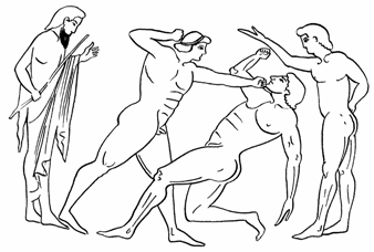 Кулачный бой как аналог современного бокса в программу древних Олимпиад вошел несколько позже борьбы. Греческие боксеры наносили сопернику удары в голову без использования ног, стараясь не затрагивать остальных частей тела. Удары в корпус были запрещены, но разрешались удары по лопаткам, по затылку, в подмышечную впадину и по локтевым суставам.