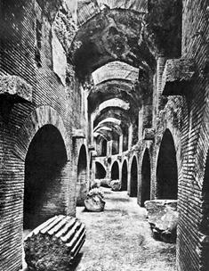 Арена Колизея достигала 86 м в длину и 54 м в ширину. Песком здесь посыпали уже не землю, а дощатый настил. Скрытые от глаз публики люки пола вели в подземелье, где располагались служебные помещения. Целый лабиринт комнат для декораций, механизмов, снаряжения, всевозможных припасов освобождал участок вокруг здания, позволяя посетителям оценить совершенство архитектуры. В подвалах амфитеатра находились залы для гладиаторов, камеры для жертв из числа преступников, приговоренных к смертной казни. Здесь же устраивались стойла для лошадей, клетки с хищниками и холодные мертвецкие.
