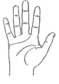 Прежде чем рассматривать основные хиротипы, поговорим о том, как подразделять человеческие ладони на чувствительные и прагматические. В основе такой классификации лежат два фактора: форма ладони и относительная длина пальцев. Прагматические ладони имеют одинаковую ширину и длину, т. е. в отпечаток руки на бумаге может быть легко вписан квадрат (рис. 2). Ладони чувствительных рук заметно удлинены и часто сужаются от основания к кончикам пальцев, выявляя в качестве базисной геометрической фигуры прямоугольник (рис. 3). Определять форму ладоней можно непосредственно на руке человека, воспользовавшись линейкой, рулеткой, измерителем или циркулем. При хорошем глазомере или достаточной хиромантической практике это можно легко проделывать и без каких-либо вспомогательных средств, т. е. «на глазок». Как следует из названия, обладатели чувствительной ладони отличаются романтическим взглядом на жизнь, и отношения между половыми партнерами эмоциональны и восприимчивы. Эмоциональные вспышки особенно характерны для владельцев удлиненной ладони, имеющей несколько коническую форму.