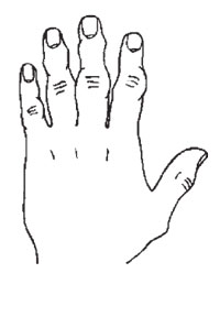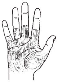 Элементарная рука – крепкая, тяжелая, малоподвижная, с короткими, как бы притупленными пальцами, несколько отогнутыми назад (рис. 10). Большой палец невелик и неуклюж, а из-за неразвитой подвижности совершенно не гнется назад. Часто он весьма укорочен, неправильной формы и оканчивается почти у основания указательного. Ладонь – широкая, толстая, твердая, квадратной формы. Кожа грубая и жесткая, часто красноватого или смуглого тона. Она часто покрывается (это особенно характерный признак данного типа руки) на наружной части волосами, а на ладони – ороговевшими мозолями. Количество линий на ладони элементарного типа очень невелико; из них хорошо выделены и просматриваются лишь 3–4 главные. В дополнение к этому следует упомянуть крепкие и широкие ногти. По выражению одного хироманта, «элементарная рука напоминает, с одной стороны, форму руки маленького ребенка, а с другой стороны, форму руки человекоподобных обезьян». Большинство людей с элементарной рукой – мужчины, а данный хиротип – не редкость в рабочей среде, у людей, занятых физическим трудом, работа которых не требует напряженной умственной деятельности. В своей профессии и повседневной жизни они основываются на физической силе, привычках и инстинктах. Главным жизненным кредо таких субъектов является удовлетворение естественных нужд, прагматичность и жесткая ориентировка на материальный мир. Они консервативны, осторожны и медлительны, любят много и сытно поесть, хорошо выпить и выспаться, удовлетворив свое сексуальное начало. К жизни особых требований не предъявляют, но нуждаются в постоянной поддержке и грамотном руководстве. Не стремятся к переменам и предпочитают стабильную и предсказуемую рабочую обстановку с минимальным количеством неожиданностей.