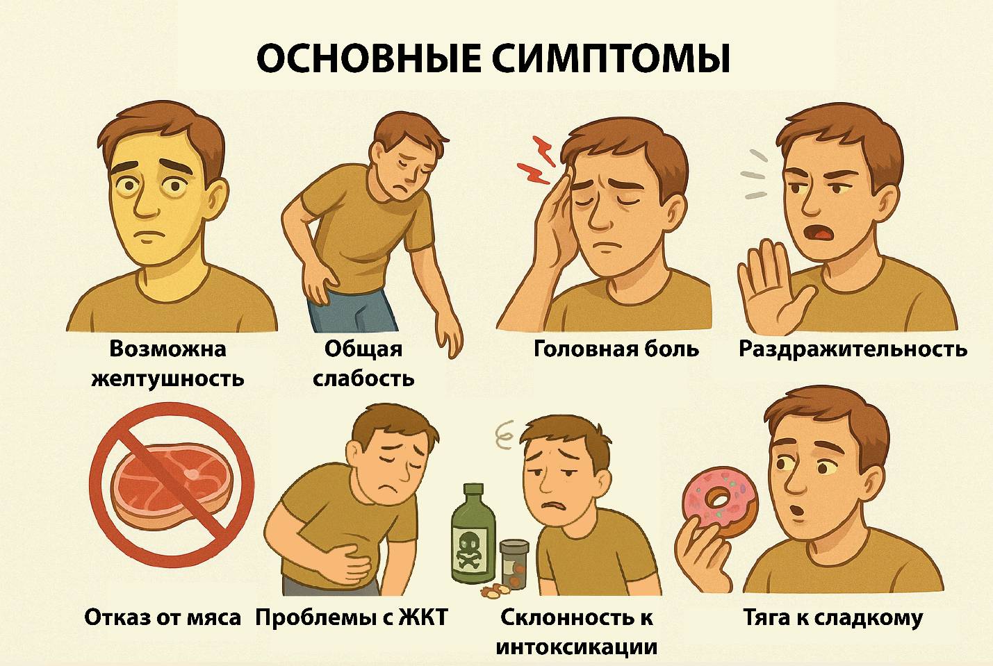 Если собрать воедино самые типичные жалобы пациентов, складывается узнаваемая картина: от лёгкой желтушности и усталости до избирательности в питании и повышенной раздражительности. На рисунке ниже представлены основные симптомы, характерные для синдрома Жильбера.