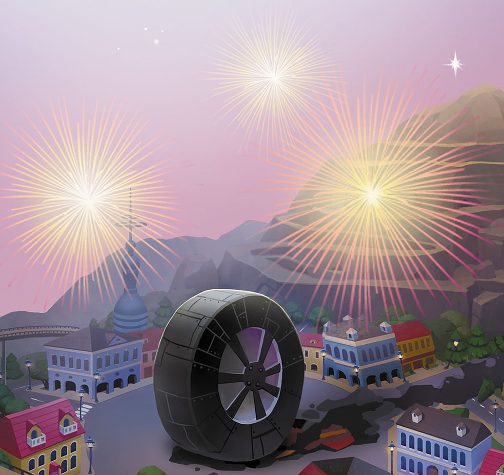 Постепенно жители Авто-Мото выехали из укрытий и окружили странное гигантское колесо. А над ними в это время продолжал сверкать фейерверк, который устроили в честь Дня города.