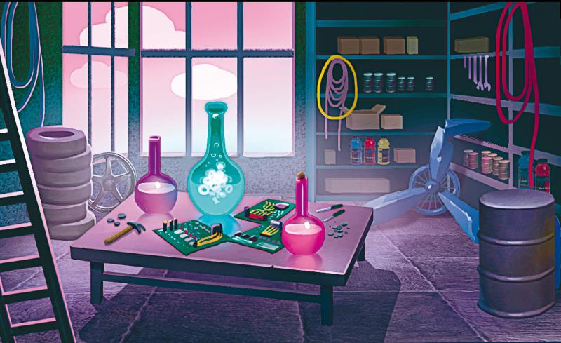 В гараже Нивика было столько всего, что и перечислить сложно. Фарик с удивлением разглядывал бесчисленные по´лки с деталями и детальками, столы с разложенными микросхемами, колбы с кипящей жидкостью…
