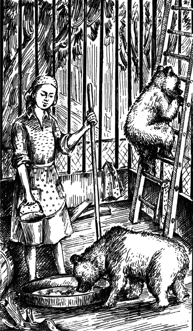 Кое-как вырвалась Гуля из тяжелых медвежьих лап и вскарабкалась по приставной лестнице, стоявшей в клетке. Оба медведя, не теряя ни минуты, полезли за ней. Вот и последняя ступенька – дальше лезть некуда.