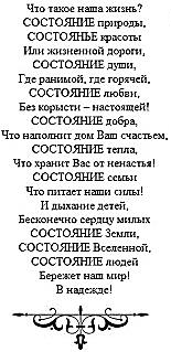 – Благодарю вас друзья за радость встречи и теплые слова, дающие энергию жить! Пусть будет, по-вашему, – поднявшись с места, согласилась Елена. Это небольшая история, и желающие, примут эстафетную палочку опыта поколений за пару вечеров! Пока будете на отдыхе, открою тайну в мир СОСТОЯНИЙ, как двери в сказку! Мечтать на ночь полезно! А для взрослых детей необходимо еще и строить планы! Согласны?