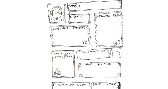 На первой странице запишите вопросы. Каждый самостоятельно вписывает ответы на своей странице. Примеры вопросов в анкете: