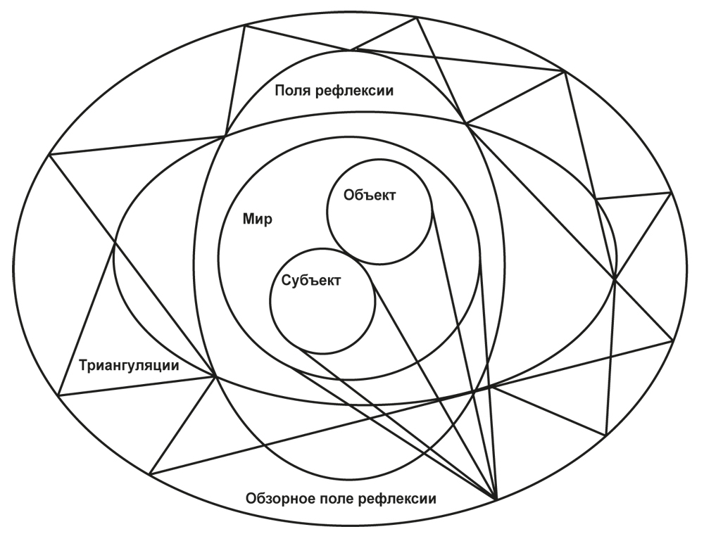Рисунок демонстрирует свободу в выборе установочного ракурса: концентрация ли непосредственно на объекте (в соответствии с идеалом классической рациональности), на взаимодействии ли объекта и субъекта, или на взаимоотношениях объекта и субъекта, представленных в разнообразии систем (в соответствии с идеалом неклассической рациональности). Помимо этого здесь добавились, с одной стороны, множественные поля рефлексии, а с другой – обзорное поле рефлексии, где осуществляется произвольное конструирование картины мира на основе разных исследовательских ракурсов. Среди интегрирующих исследовательских стратегий наряду с вышеупомянутыми возможны: «триангуляция» (как чередующаяся смена методологической оптики) и «смешанные методы» (смена исследовательской оптики и скольжение мысленным взглядом от одного познавательного ракурса к другому). Сочетание ракурсов создает новые, избыточные, иногда неожиданные и ранее не очевидные возможности. Наиболее проблематичной и одновременно креативной областью становится обзорное поле рефлексии, где решаются задачи синтеза и интеграции исследовательских стратегий.